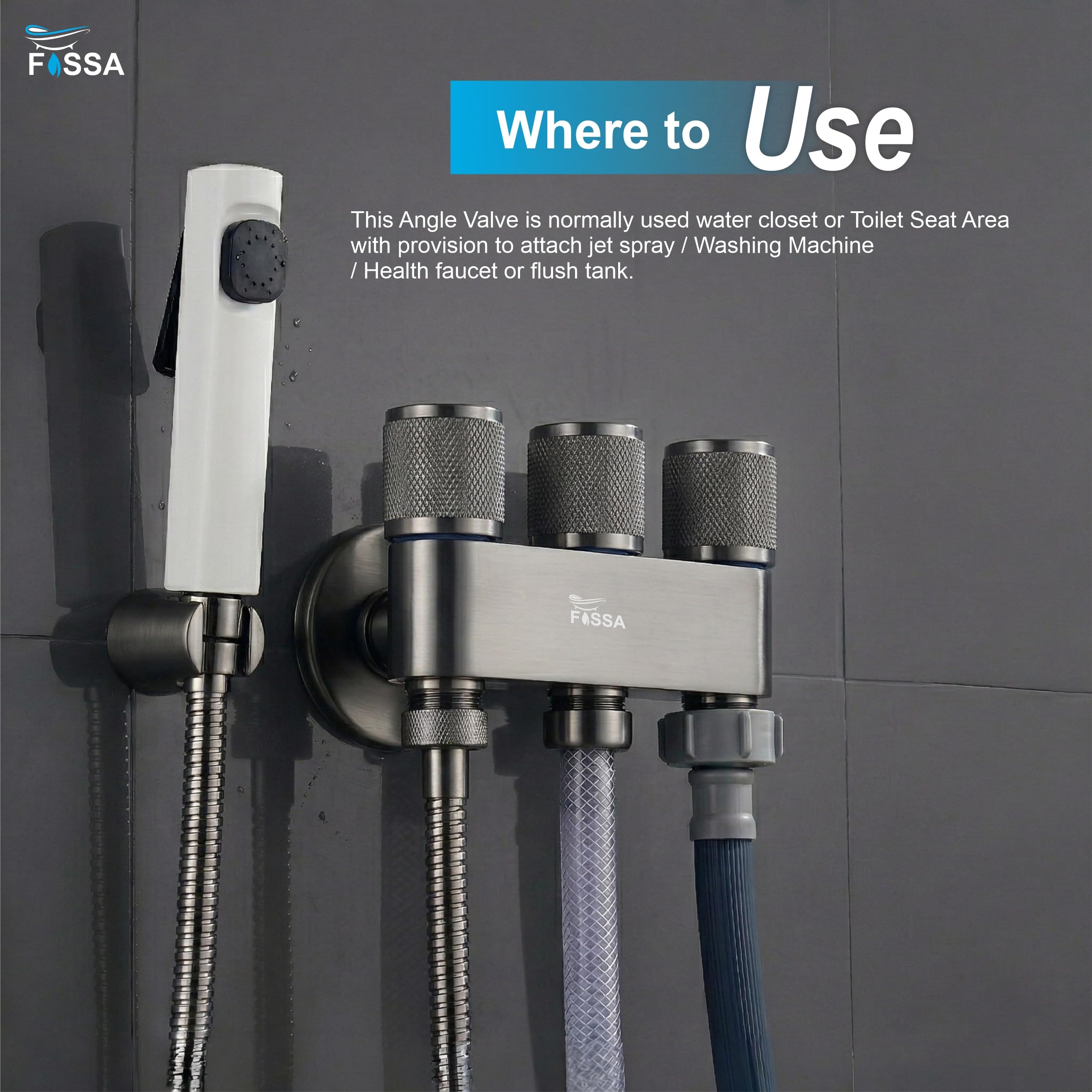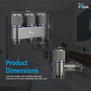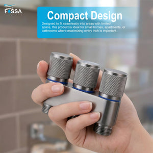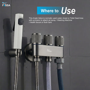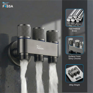 Three-outlet laundry faucet with durable stainless steel angle valve in Grey finish, designed for smooth water control and multi-purpose connections. Ideal for washing machines, utility taps, and everyday household use.