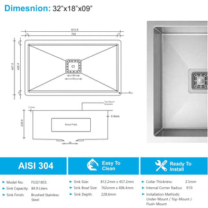 Aqua 304 Handmade (32 x 18 x 09 ) Inch Stainless Steel Single Bowl Silver Kitchen Sink